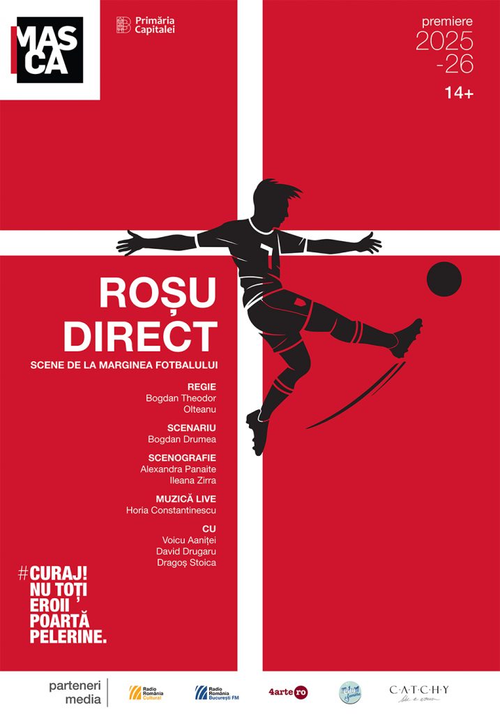 Roșu direct – Scene de la marginea fotbalului propune 75 de minute de teatru dens, intens și deștept, cât o repriză secundă și o porție completă de prelungiri dintr-un meci de fotbal a cărui primă repriză a început cândva, demult, pe vremea când Ole-urile din tribune se mutaseră pe străzi și celebrau căderea unui dictator, și ale cărui penalty-uri amenință să fie executate în fiecare mâine din viețile noastre curente. Un joc de noroc sponsorizat de o casă de pariuri amenință să fie, uneori, deopotrivă fotbalul și viața. Sau poate că există și o altă cale. (Mihai Brezeanu, Un joc de noroc? – Roșu direct)
